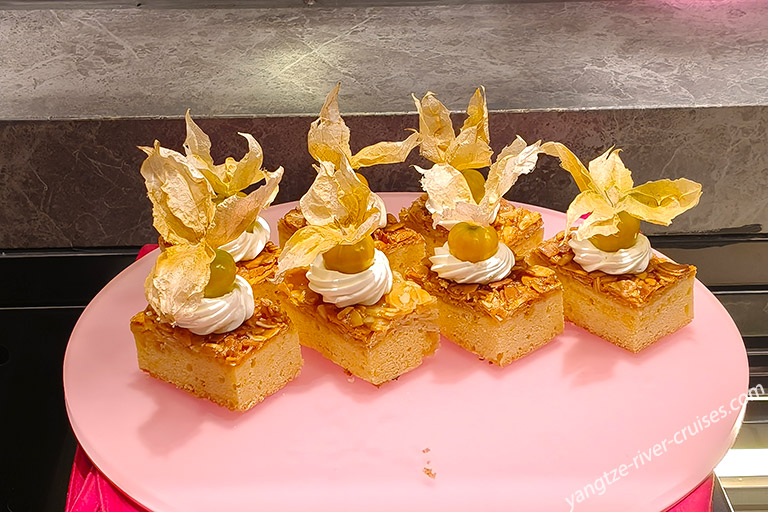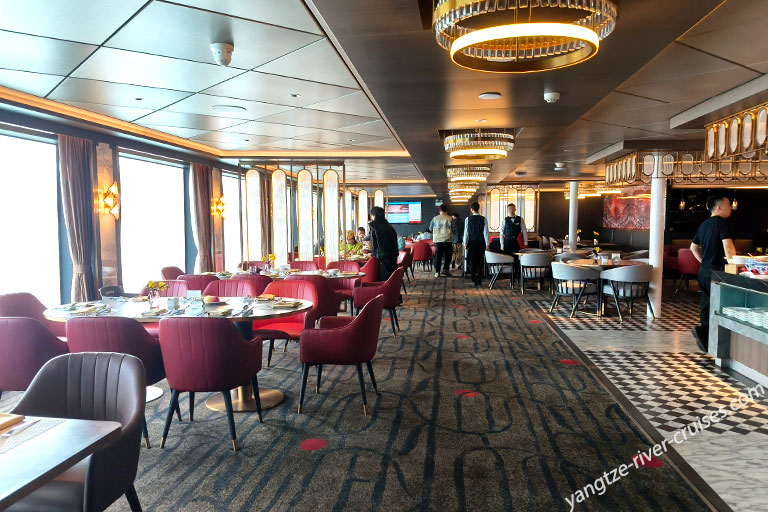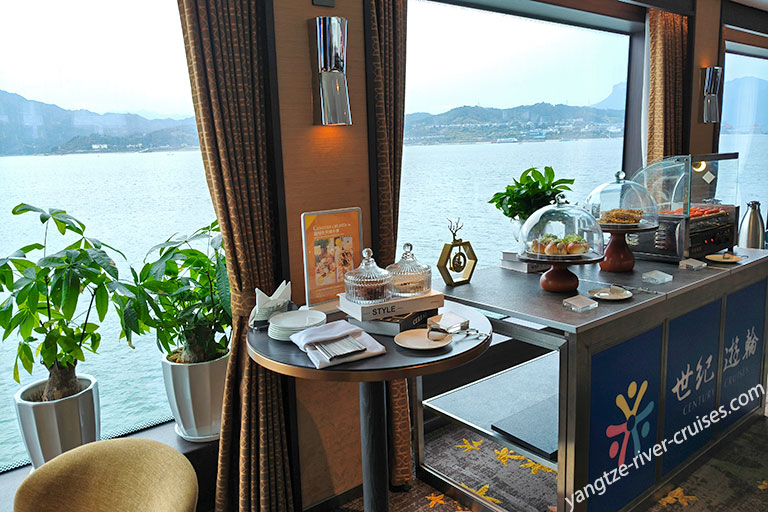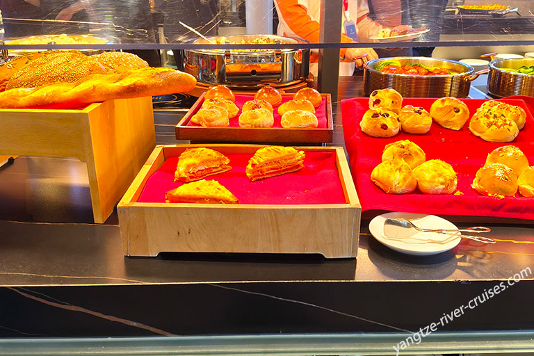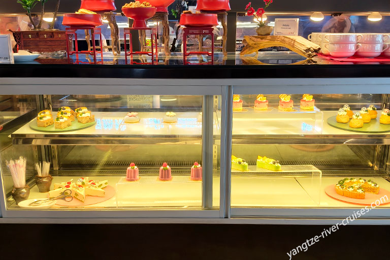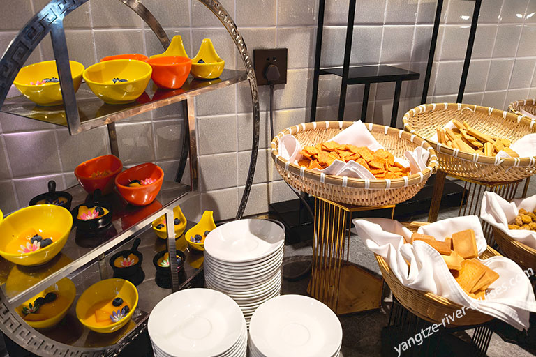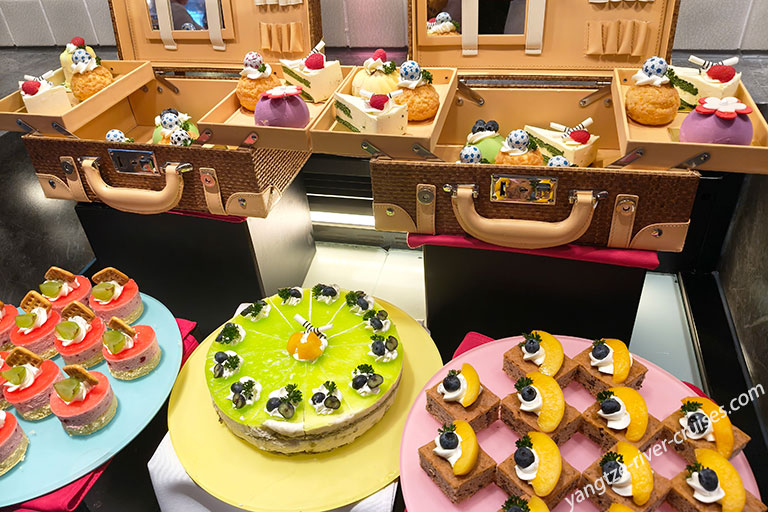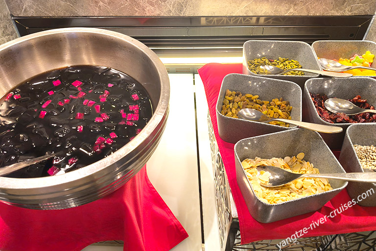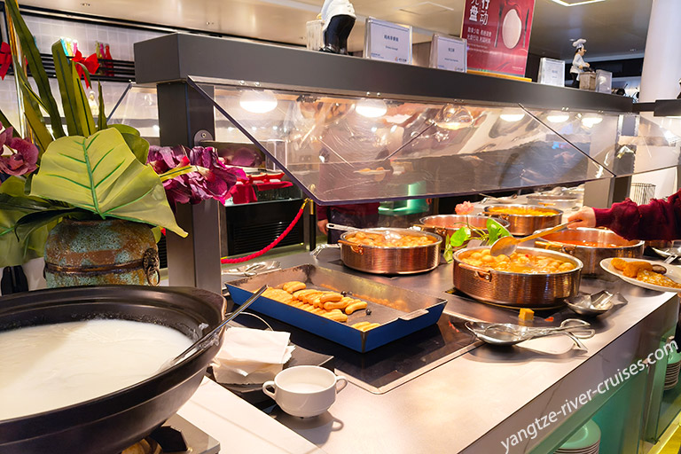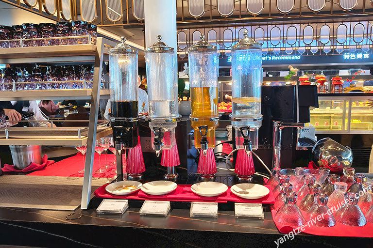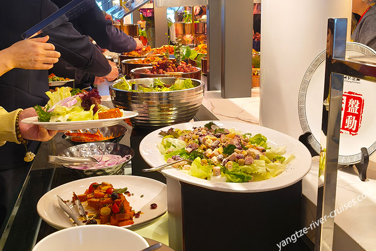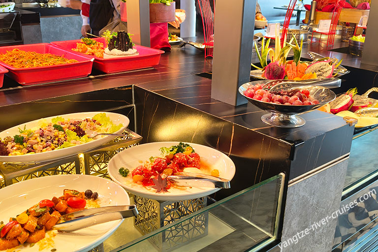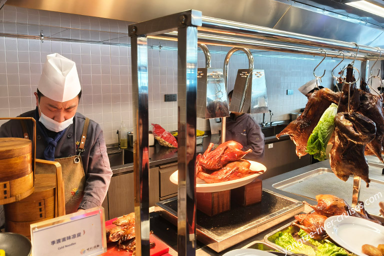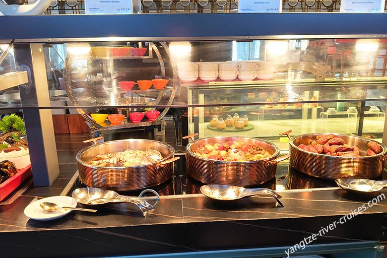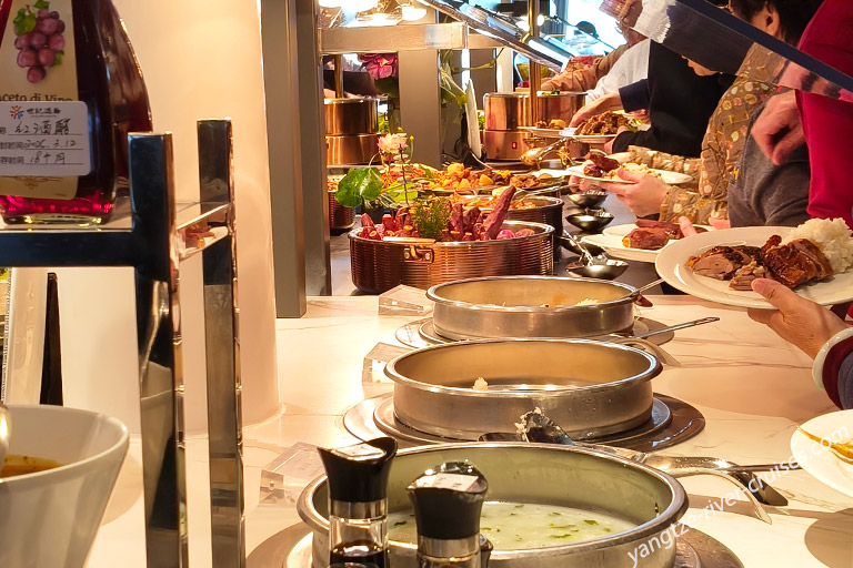 The first dinner is included—a generous touch since many cruises skip this. The double-height Global Restaurant on decks 2-3 serves a surprisingly diverse buffet: Western stations, Chinese hot dishes, a salad bar, and designated free-flow wines and beers. The Steamed Sea Cucumber with Millet that fellow travelers raved about? I found it, and it lives up to the hype.