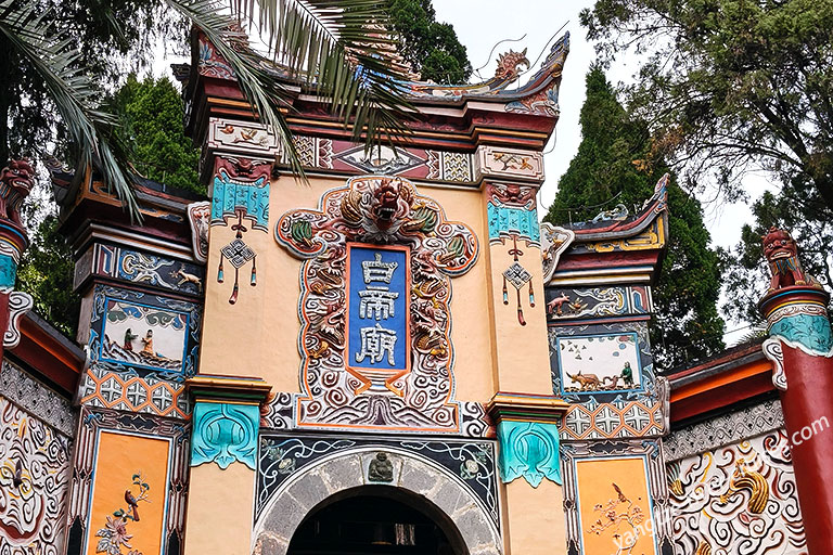The descent offers its own reward: the ornate gate of Baidi Temple itself. I find myself lingering before this entrance, studying the intricate craftsmanship—vivid polychrome dragons coiling around the central plaque, delicate floral panels in blue and white porcelain style, the double-happiness character woven into decorative vases, all framed by curling cloud motifs and traditional rooflines with upturned eaves. The colors have softened with age but not faded; the detail rewards close inspection. Palm fronds frame the structure from above, adding an unexpected tropical note to this thoroughly Chinese scene.