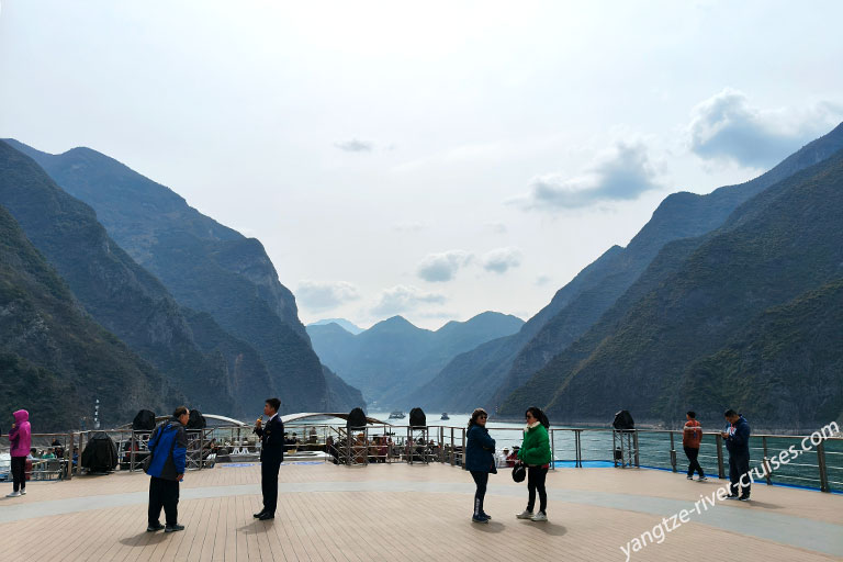 Then comes Qutang Gorge—the shortest, the steepest, the most dramatic. The very landscape from the back of a 10-yuan note unfolds before my eyes: the Kui Gate, two mountains like massive pillars squeezing the river to a ribbon. I abandon my balcony for the 6th-floor sun deck—unobstructed, 360-degree, pure visual intoxication.