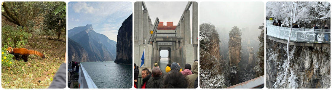 - Highlights: Chengdu Panda Base, Liziba Station, Three Gorges, Three Gorges Dam, Zhangjiajie National Forest Park, Tianmen Mountain…